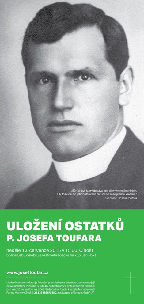 Předpokládané uložení ostatků P. Josefa Toufara v číhošťském kostele při poutní slavnosti 12. července tohoto roku bude vyžadovat finanční prostředky na důstojnou schránu a její citlivé umístění. Prosíme ty, kdo by tento úmysl chtěli věnovat finanční dar, nechť ho zašlou na účet Nadačního fondu kostela Nanebevzetí Panny Marie v Čihošti: 253 394 896 / 0300, zpráva pro příjemce HrobP.JT. Pokud zbudou nějaké prostředky, budou použity na další renovaci kostela a fary. Všem dárcům předem upřímně děkujeme.